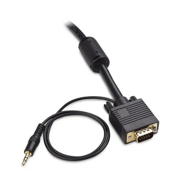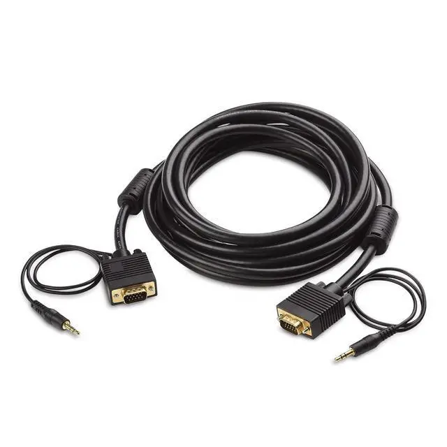 High performance computer monitor cable connects a VGA (Video Graphic Array) equipped computer to a monitor or projector with 15-pin VGA port (also known as RGB DB-15 DE-15 HD-15 HDB-15 or D-sub 15) for video editing gaming or video projection; The VGA to VGA cable supports both video and audio with a single cablePremium VGA cables support resolutions at 800x600 (SVGA) 1024x768 (XGA) 1600x1200 (UXGA) 1080p (Full HD) 1920x1200 (WUXGA) and up for high resolution LCD and LED monitors; The RGB cable supports 3.5 mm stereo audio pass-throughThe VGA cord engineered with molded strain relief connectors for durability grip treads for easy plugging and unplugging and finger-tightened screws for a secure connectionGold-plated connectors resist corrosion provide rigidity and improve the signal performance of the VGA male to male cableFoil & braid shielding of the PC cable minimizes crosstalk suppress noise and protect against electromagnetic interference (EMI) and radio frequency interference (RFI)