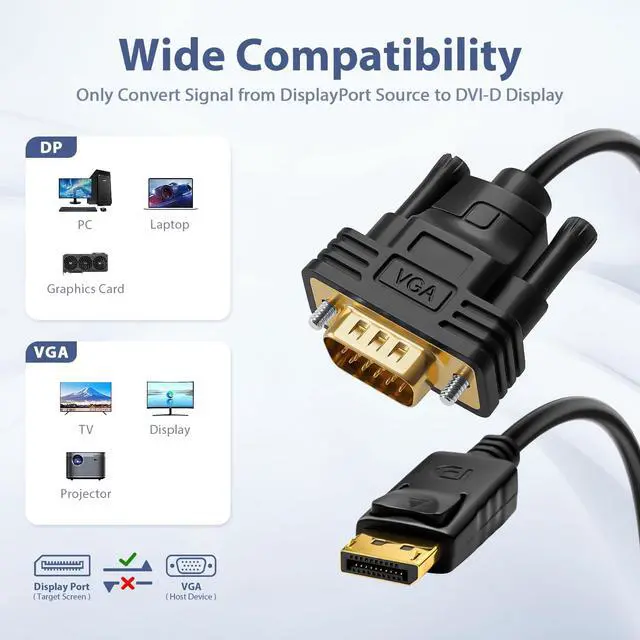 VGA Unidirectional Transmission: This DisplayPort to VGA cable can stably connect desktops and laptops with DP interface to monitors and projectors with VGA input.