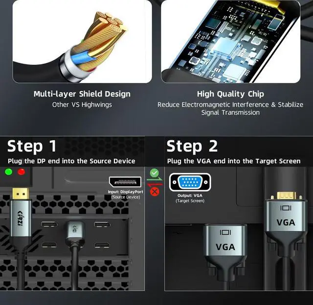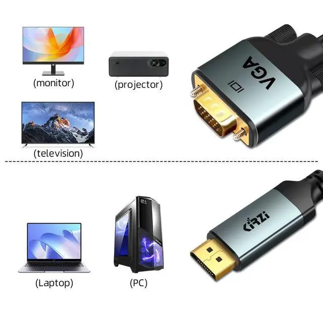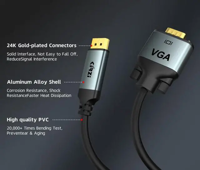 COMPATIBILITY: Connects DisplayPort-enabled devices to VGA displays perfect for monitors desktops laptops and projectorsINCREDIBLE PERFORMANCE - The DisplayPort male to VGA Male converter supports resolutions up to 1920x1080@60Hz (1080p Full HD) including 720p 1600x1200 1280x1024 for high definition monitors or projectors; Gold plated DisplayPort connector resists corrosion and abrasion and improve the signal transmission performance; Molded strain relief increases cable durabilitySUPERIOR STABILITY - Built-in advanced IC chip converts DisplayPort signal to VGA signal; It is NOT a bi-directional converter and cannot transmit signals from VGA to