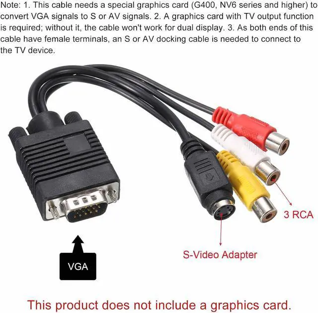 Total Length: 20cm/8 inchScrew-in VGA cable with 15P. Durable and easy to plug and play by gripping pedals secure connection by tightening screws with fingers. Connects a VGA-equipped computer to any monitor with a 15-pin VGA port. Please note that the cable type is VGA to TV S-Video 3 RCA Cable.