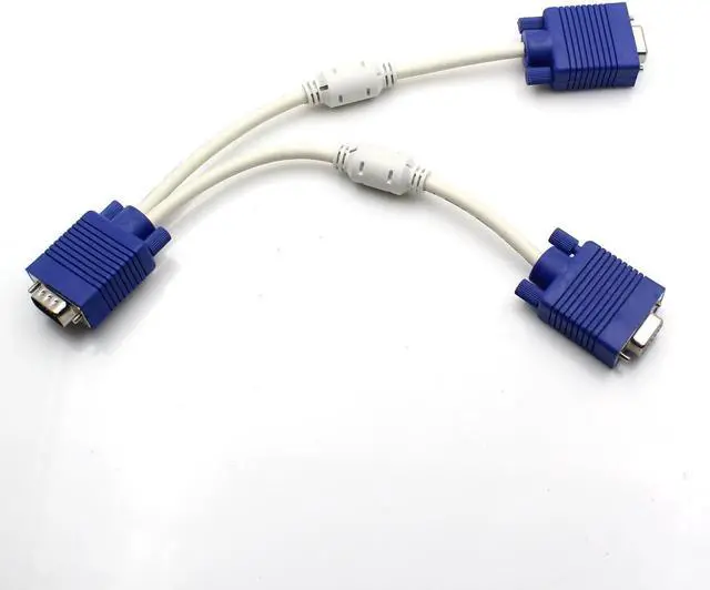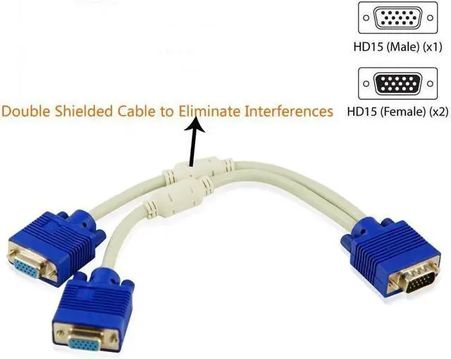 100%Brand New and High Quality Cable; Make sure this product is compatible with the video resolution you are using before buyingConvert a male VGA connector into two female VGA ports with this male to female VGA splitterThe VGA Y splitter supports resolutions at 800x600 (SVGA) 1024x768 (XGA) 1600x1200 (UXGA) and 1080p for high resolution LCD and LED monitorsThe VGA monitor splitter splits a VGA input (also known as RGB DB-15 DE-15 HD-15 HDB-15 or D-sub 15) to two VGA outputs; Two VGA cables (sold separately) are requiredThis is a passive cable which only duplicates the PC screen to monitor