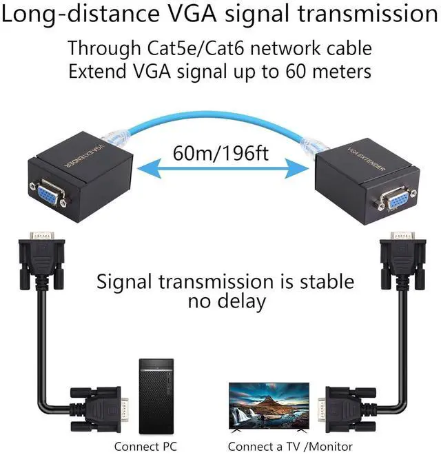50% Cost ReductionVGA extender adapte over you only need a cat5e/cat6 pure copper cable you only need to pay a lower cost you can enjoy VGA signal reception within a range of 60m through the VGA extender adapter convert no delay stable transmission high-definition picture quality. Smart ConversionBuilt in high quality smart chip support cat5e/cat6 to VGA signal conversion to ensure the same input and output. more importantly it ensures stable signal transmission and high definition picture quality bringing you a better experience. High Quality MaterialVGA extender with galvanized alloy shell strong and durable anti-lightning dustproof anti-static and ensure fast cooling better use effect.