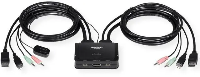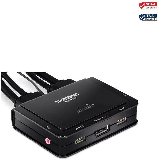 TRENDnets 2-Port 4K DisplayPort KVM Switch, model TK-220DPi, allows you to control two computers with one set of console controls. Easily experience up to 4K UHD resolutions, no driver installation required. This compact DisplayPort switch is designed for 4K DisplayPort systems with USB mouse and keyboard connections. This UHD DisplayPort KVM switch also features 3.5mm speaker and microphone connections to switch between computers.