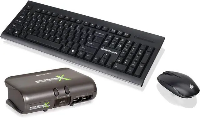 The GCS1732-KM1 is a special combo which combines the power of IOGEAR's popular 2-Port USB KVMP and the Long Range 2.4GHz Wireless Media Center Keyboard and Mouse. This allows you to work wirelessly across 2 computers attached to the KVMP for an efficient and convenient working station.