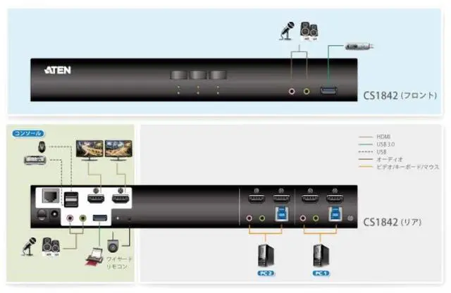 Connect two CS1842 devices for an operator-controlled quad display setup The ATEN CS1842 Dual Display KVMP Switch provides a valuable solution for desktop workstations with instant and effortless access to two computers with HDMI interface via a single USB keyboard, mouse and two HDMI monitors. To meet user requirements, the CS1842 meets the HDMI 2.0 standard and supports superior video quality up to 4K DCI (4096 x 2160 at 60 Hz), which provides an overwhelming and vibrant display.