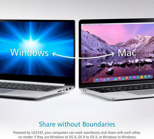 The video showcases the product in use.The video guides you through product setup.The video compares multiple products.The video shows the product being unpacked. No more dealing with plugging and unplugging. Connect your USB-C laptops to US3342 and start sharing peripheral devices. Use only one set of keyboard and mouse to seamlessly control two systems and to share data and multiple USB devices without the need to plug and unplug or configure complicated network-based server/client setups.