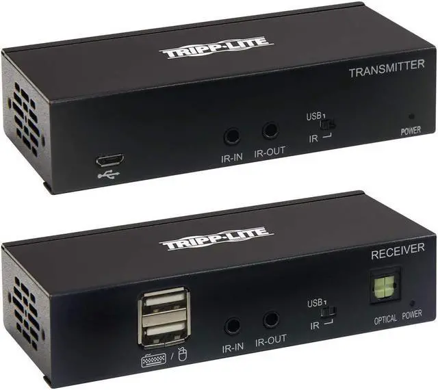 By adding a Tripp Lite B127A-010-H HDMI repeater or B127A-110-BH transceiver (sold separately) to the application, you can extend the signal up to 400 or 460 feet, respectively. Dip Switches Extend Your Choice of Either USB or IR. The DIP switches on both the transmitter and receiver can be adjusted to let you choose from the USB 1.1 or bi-directional IR functions. Choose to either control the source device via keyboard and mouse or IR remote control from the display end of the installation. Only one function can be extended at a time.