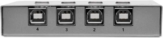 Conveniently share a printer, scanner or external hard drive between four computers. Quickly switch between computers using keyboard hot-keys, mouse or manually with one-touch switching. Plug-and-play functionality through USB connectivity requires no additional power source and provides simple setup. Compact LED display lets users monitor live connections and switch status.