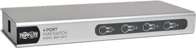 Tripp Lite's 4-port B022-004-R KVM Switch is the optimal solution for controlling 4 computers from one keyboard, mouse and monitor. Installation is a snap - just connect the PCs using Tripp Lite's P774-Series (PS/2) or P776-Series (USB) KVM cable kits (Not included). No software or complicated set-up procedures are required. Easily switch between computers via the front-panel push buttons or keyboard hotkey commands. 3-year limited warranty
