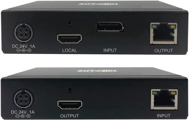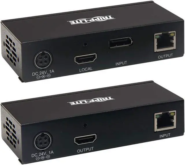 DisplayPort to HDMI Extender Kit Ideal for Digital Signage or Displaying Video in Schools or Trade Show Booths This complete transmitter and receiver system is recommended for video presentations in conference rooms, schools, trade shows, meeting facilities, houses of worship, retail settings and digital signage applications where the source and display are farther apart than conventional A/V cables allow. The B127A-1A1-BDBH extends 4K video and stereo audio signals from a DisplayPort source to an HDMI display up to 230 feet away via user-supplied Cat6 cabling. USB 1.1 ports on the receiver end allow for the connection of a keyboard and mouse. The maximum transmission distance can be extended to a total of 400 ft. when used with Tripp Lite's B127A-010-H signal booster. Transmits Crystal-Clear 4K HDMI Video with Multi-Channel Audio and 4:4:4 Color The B127A-1A1-BDBH supports Ultra High Definition (UHD) video resolutions up to 4K x 2K (3840 x 2160) at 60 Hz, as specified by HDMI 2.0, with full, rich uncompressed DTS-HD, Dolby TrueHD and 7.1-channel digital audio. Built-in equalization automatically fine-tunes the image quality at the remote display with no time-consuming manual fiddling needed. Its compatible with HDCP 2.2 and EDID. It also supports 4:4:4 chroma subsampling for top-level PC gaming or using your HDTV as a PC monitor. Built-In PoC Technology Provides Receiver Power to Avoid Bulky External Power Bricks Built-in bi-directional Power over Cable (PoC) technology powers the transmitter or receiver over Cat6 cable opposite from the connected external power supply. Green and orange LEDs on both the transmitter and receiver will light up to indicate the system is receiving power and a signal is being transmitted. Plug-and-Play Operation for Quick Setup and Immediate Use The included transmitter and receiver units work right out of the box with no software required. Mounting hardware is included for installing the units on walls, poles or 19-inch racks. Connect the DisplayPort transmitter to the source with a user-supplied DisplayPort cable and the receiver to the display with a user-supplied HDMI (such as Tripp Lites P568- or P569-Series of HDMI cable and P580-Series of DisplayPort cable). Then, connect the two units using Cat6 patch cable (such as Tripp Lite N202-Series cable). Connect an optional display to the transmitters local HDMI output to monitor the image connected to the receiver up to 125 feet away. TAA-Compliant for GSA Schedule Purchases The B127A-1A1-BDBH is compliant with the Federal Trade Agreements Act (TAA), which makes it eligible for GSA (General Services Administration) Schedule and other federal procurement contracts.