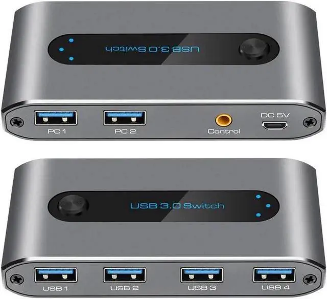 USB 3.0 switch allows up to 2 separate computers to share 4 USB 3.0 peripherals such as mouse and keyboard, printer, hard drive drivers, avoiding frequent plugging and unplugging. Supports buttons on the front and external switch button to control the selector to switch inputs. Low power consumption can work without additional power supply of the device. Thanks The LED display can be the LED You can easily see which computer is being controlled.
