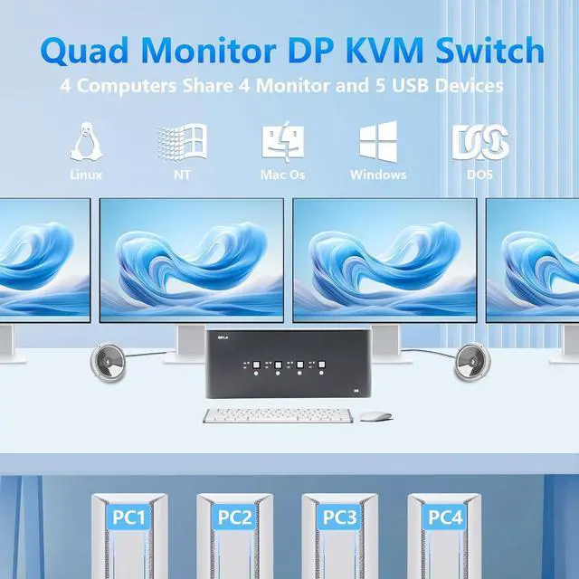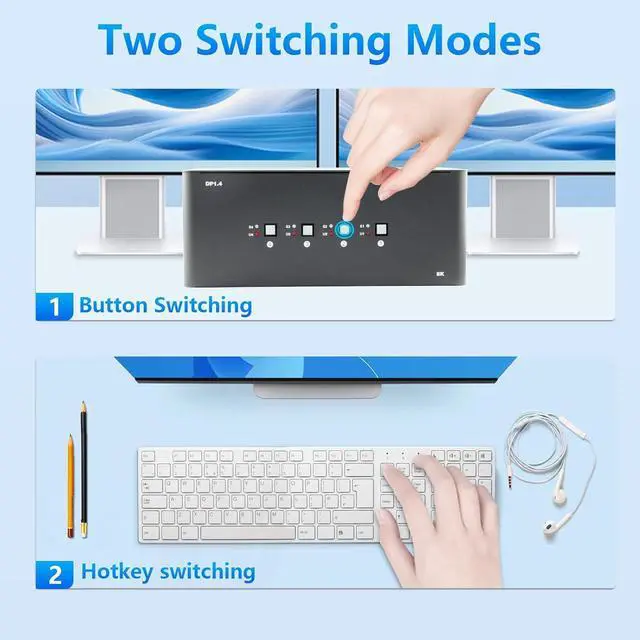 Whether you need two or three screens, this switch adapts to fit your needs. Enjoy options for extended, mirrored, or spliced displays up to 4K.With the computer graphics card, it can support three display modes: extended display, mirror display and splicing display.2 computers / laptops share one set of keyboard, mouse and 2 monitors,one audio, microphone.