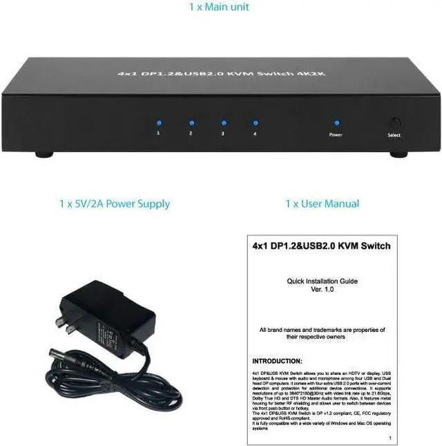 We expertise innovating high-performance and best in class products to serve our global partners and customers We are committed to bringing the cutting-edge technology superior quality at the affordable prices to work with our partners and customers by year on year revenue growth4x1 DP USB KVM Switch allows you to share an HDTV or display USB keyboard mouse with audio and microphone among four USB and Dual head DP computers It have four extra USB 20 ports with overcurrent detection and protection for additional device connections It supports resolutions of up to 3840 216030Hzwith video link rate up to 216Gbps Dolby True HD and DTS HD Master Audio formats Also it features metal housing for better RF shielding and allows the user to switch between devices via front push button or hotkey The 4x1DPUSB KVM Switch is DP v12 compliant CE FCC regulatory approved and RoHS compliant It is fully compatible with a wide variety of Windows and Mac OS operating systems Features. 4 x 1 Display Port 12 USB20 KVM Switch 4K2K. Saves space and equipment Share an HDTV or display. USB keyboard mouse with audio and microphone between 2 USBDP computer. Provides an additional USB 20 ports with overcurrent detection and protection. Switch between devices via front push button or hotkey. Metal housing for increased RF shielding. Supports Dolby True HD and DTS HD Master Audio formats Content. Main unit x1. User Manual x1. 5V2A Power Supply x1Requirements. Windows Mac Linux computers. Game consoles BluRay DVD players and other Consumer Electronics devices Specifications. Weight 21 lbs.