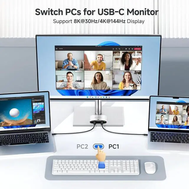 Ultra-Fast 20 Gbps USB4 /USB-C Switcher for 2 Computers: Instantly share a USB-C monitor or Thunderbolt 4 Monitor or a Thunderbolt docking station between two laptops with this versatile USB C KVM switch. Connect the pigtail cable to your monitor or docking station and the included 3.3ft USB-C/USB4 cables to two computers for seamless device sharing. Achieve lightning-fast data transfer speeds up to 20 Gbps, perfect for large file transfers, high-resolution video streaming, and demanding applications.