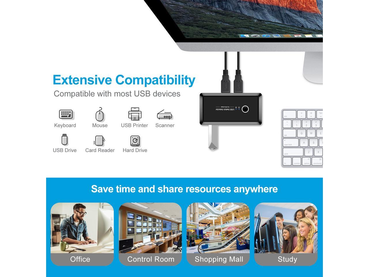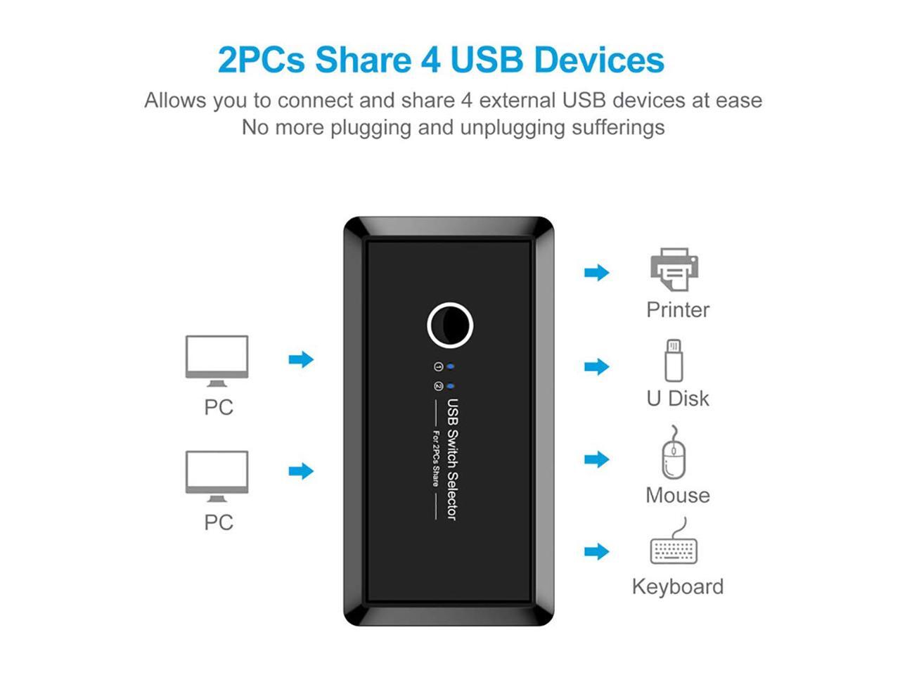 - This USB Switch 4 Port device allows up to 2 users to share 4 USB 3.0 peripheral devices, such as printer,scanner,mouse,keyboard or usb disk etc without the need to constantly swap cables or set up complicated network sharing software. It's a great for use at home if you have multiple PCs or Macs.