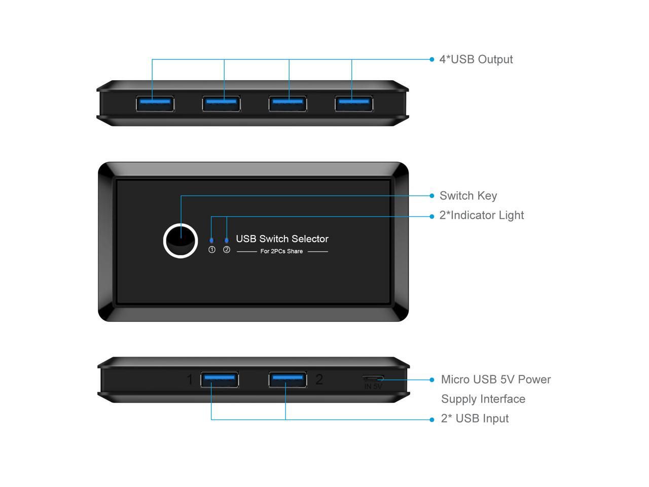 - USB 3.0 Switch 2-to-4 is an excellent choice to share 4 USB devices between two systems.