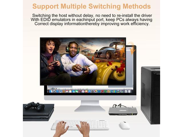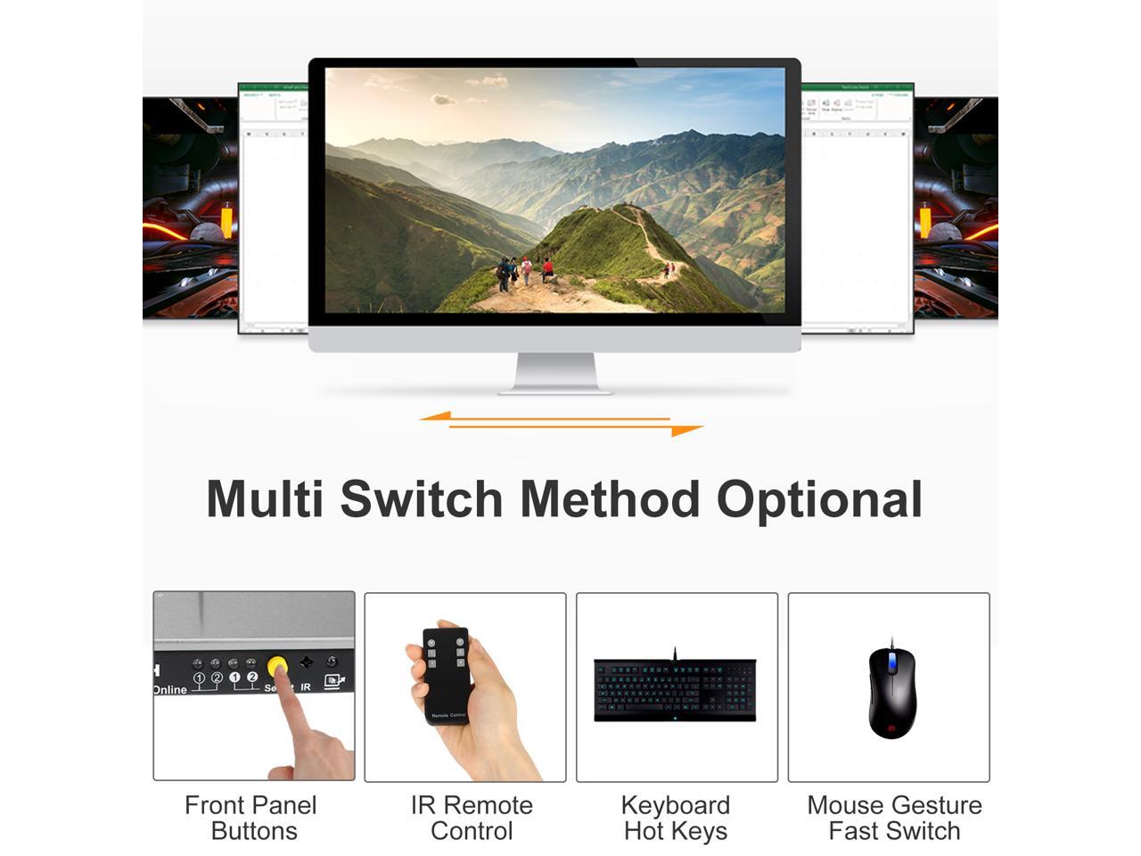 - Support front panel buttons, IR signals, keyboard hot keys to control KVM switch