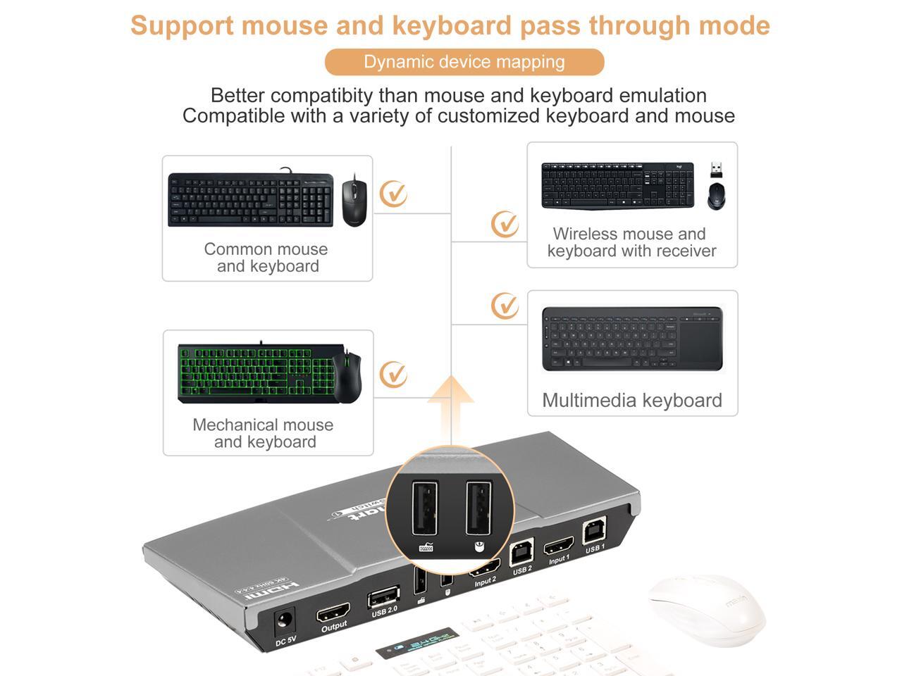 - Support hot plug, connect or disconnect devices to the KVM switch at any time without turning off devices