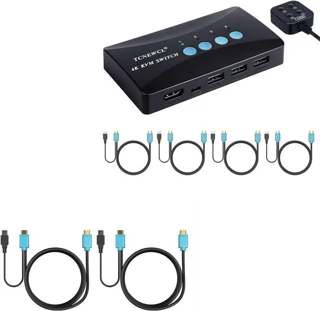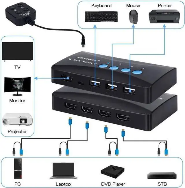 Ideal Sharing Devices: USB HDMI KVM Switch Box allows you to control 4 PCs and share 1 Video Monitor and 3 USB Devices such as a printer, scanner, mouse, keyboard, card reader, flash drive. It includes 4KVM cables so you can use one KVM cable for HDMI & USB data transmission that make your workspace tidy and efficient.