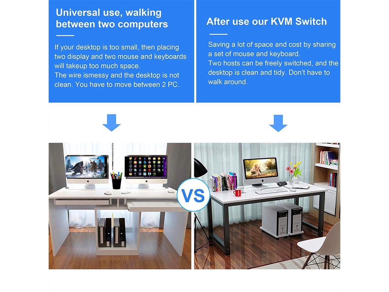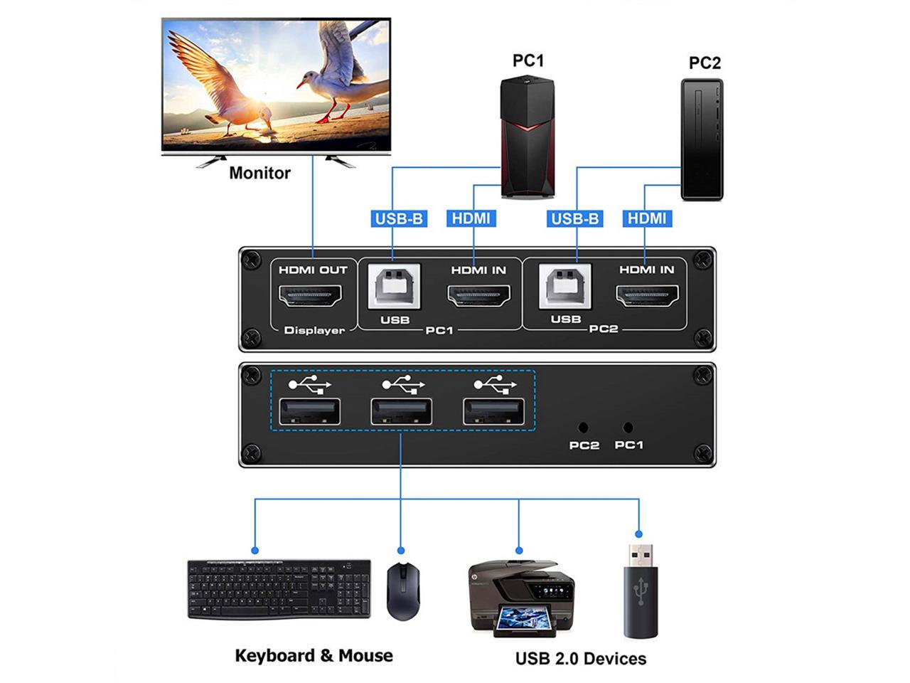 - 4K HDMI KVM Switcher Box allows you to control 2 computer with only one set of controls and display screen (mouse and keyboard).