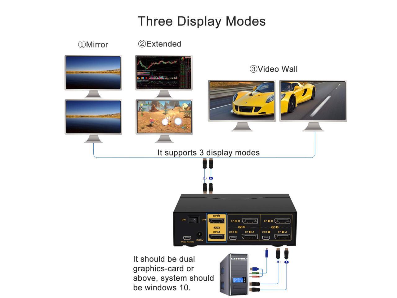 - 2x2 KVM SWITCH DUAL MONITOR DISPLAYPORT Hooking up 2 dual Display Port desktops and / or Laptops to share one set of keyboard, mouse and 2 monitors for extended, mirrored display; Perfect for computers with 2 DisplayPort graphic outputs and 2 DisplayPort monitors; Each computer needs to have 2 video connection to the KVM Switch, Please be aware of adapters you might need for your configures before order.