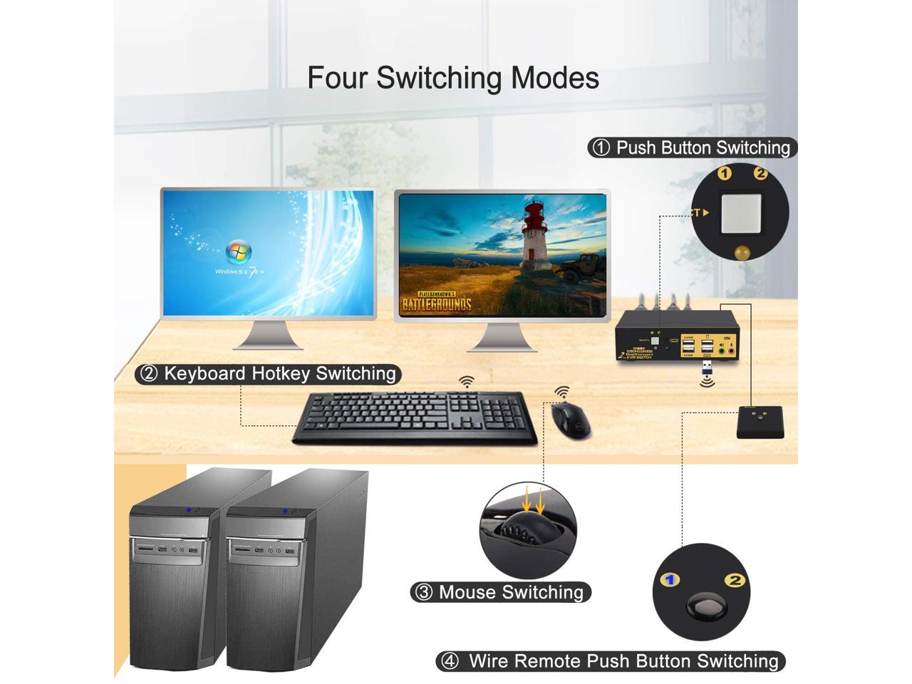 - DISPLAY PORT KVM SWITCH WITH ADVANCED SWITCHING MODES It provides several switching options for different scenarios: 1. Keyboard Hotkey. 2 Mouse click. 3 Push button. 4 Wired Remote. 5. Auto scan with adjustable interval (for monitoring and testing)