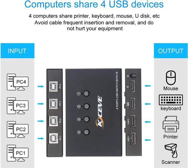 1, This USB 2.0 switch is for 4 computers to share 4 USB devices, such as mouse, keyboard, printer, scaner, hard drive, etc.