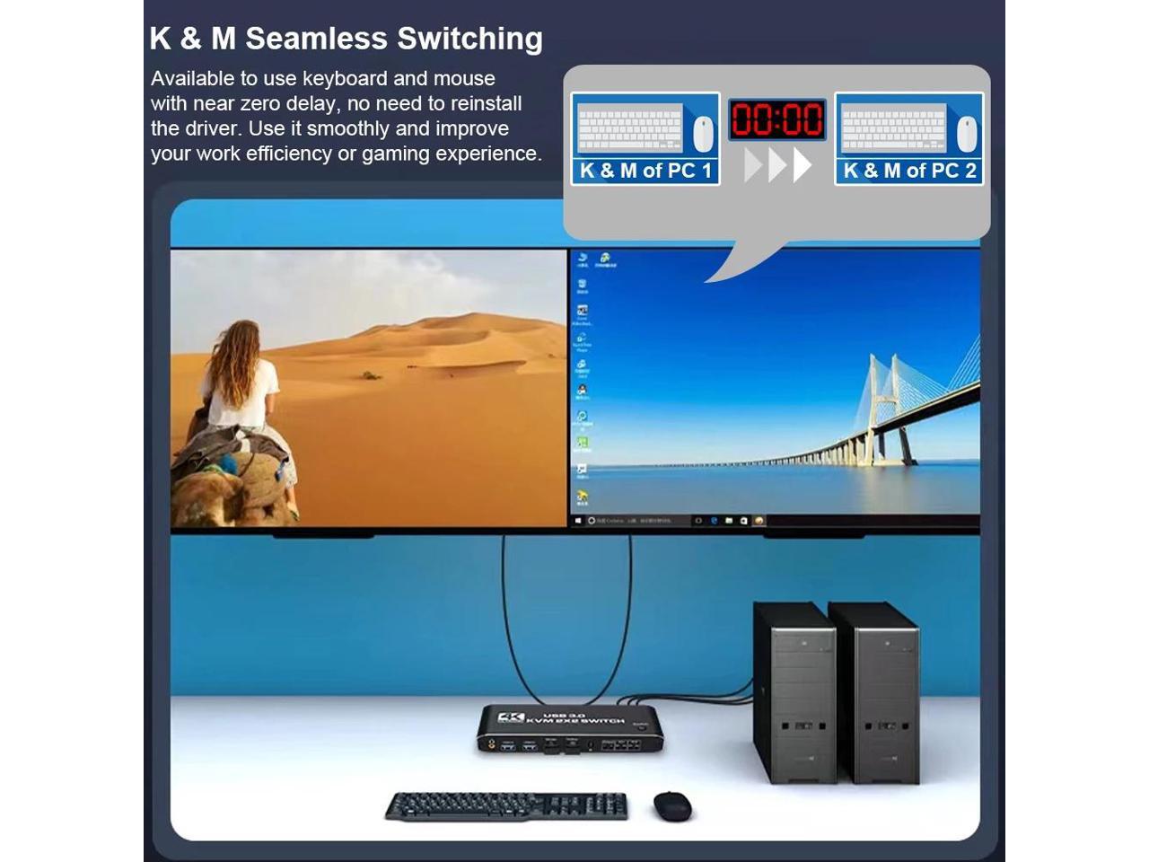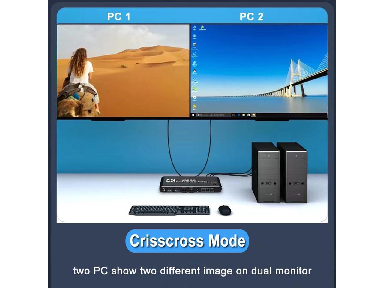 - [HDMI KVM USB switch dual monitor] This KVM Switch allows control 2 computer with one set of controls (keyboard and mouse) and two display screen. Realizes 2 in and 2 out free selection synchronous switching. You can centrally control and manage hosts laptop or game console without having to move from one workstation to another.