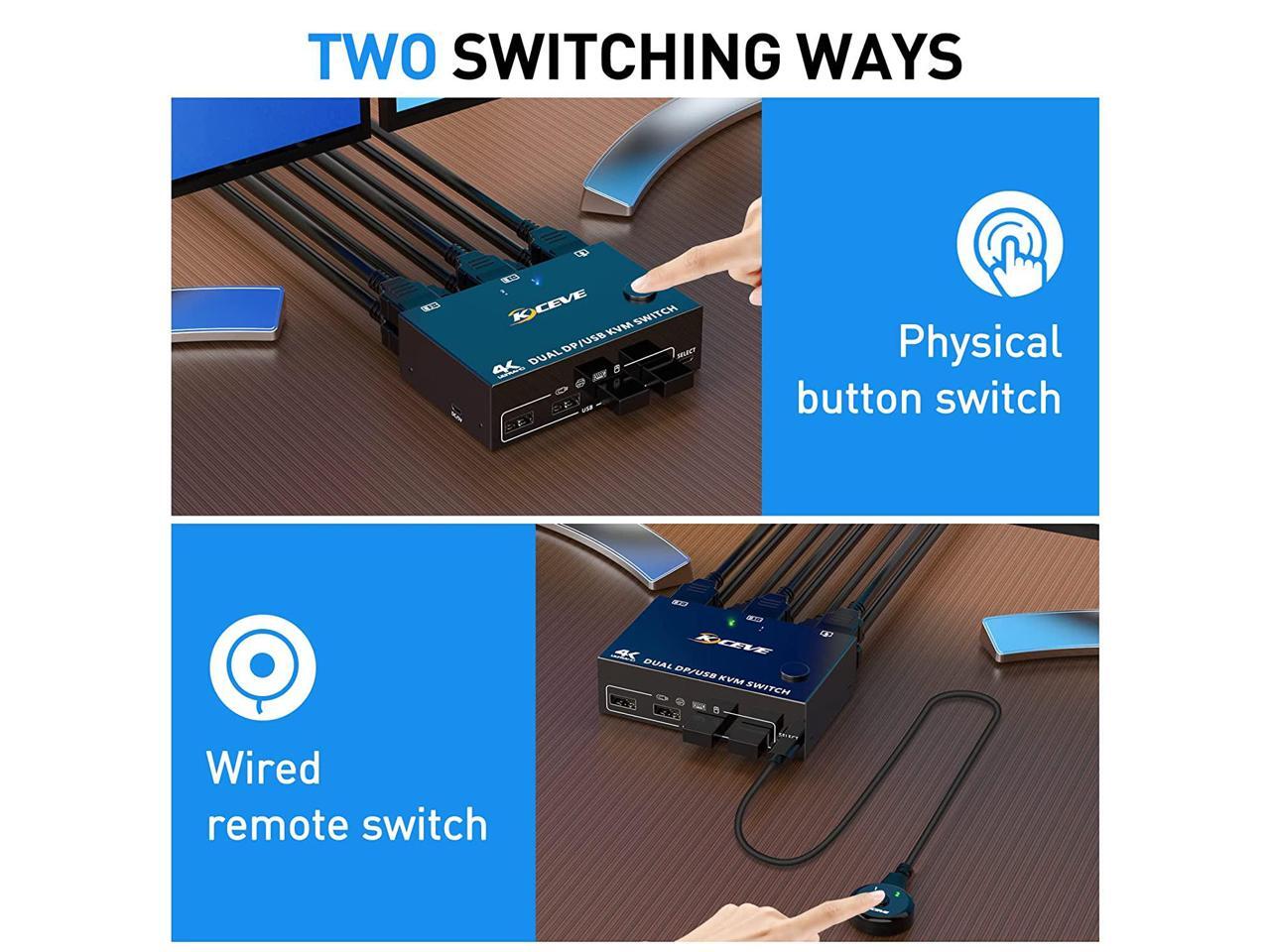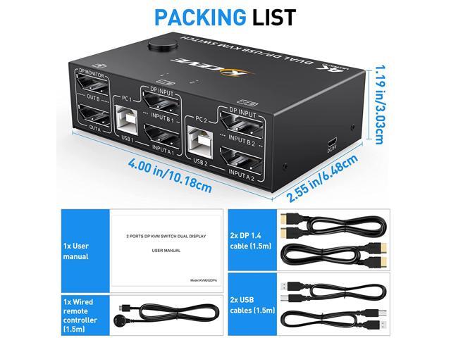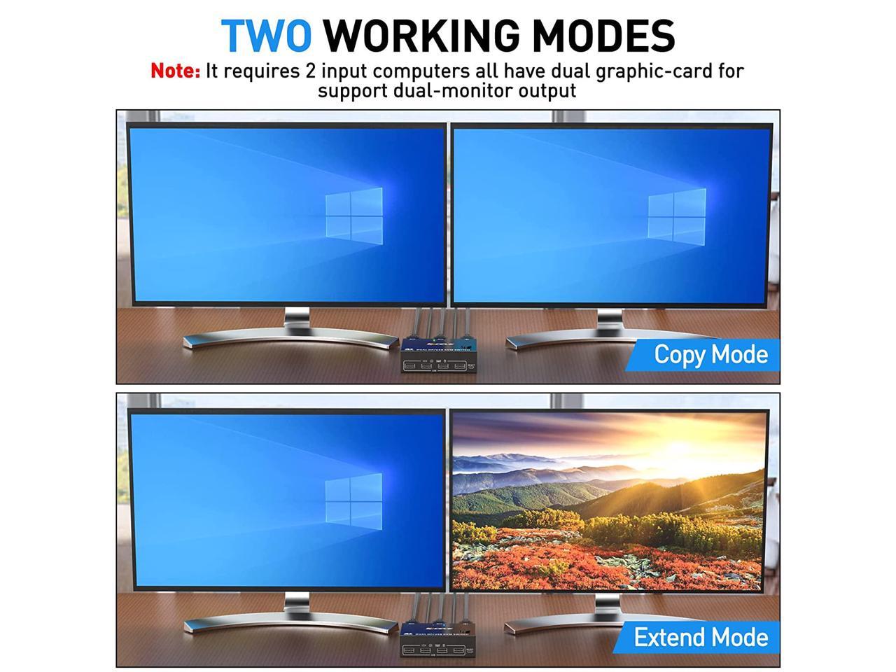 - [Dual Monitor Displayport 1.4 KVM Switch] Dual Monitor DP 1.4 KVM Switch helps 2 computers or laptops to share 2 monitors,1 set of keyboard, mouse and 4 USB 3.0 devices,support extend mode and copy mode.
