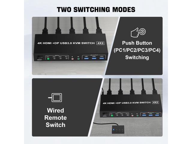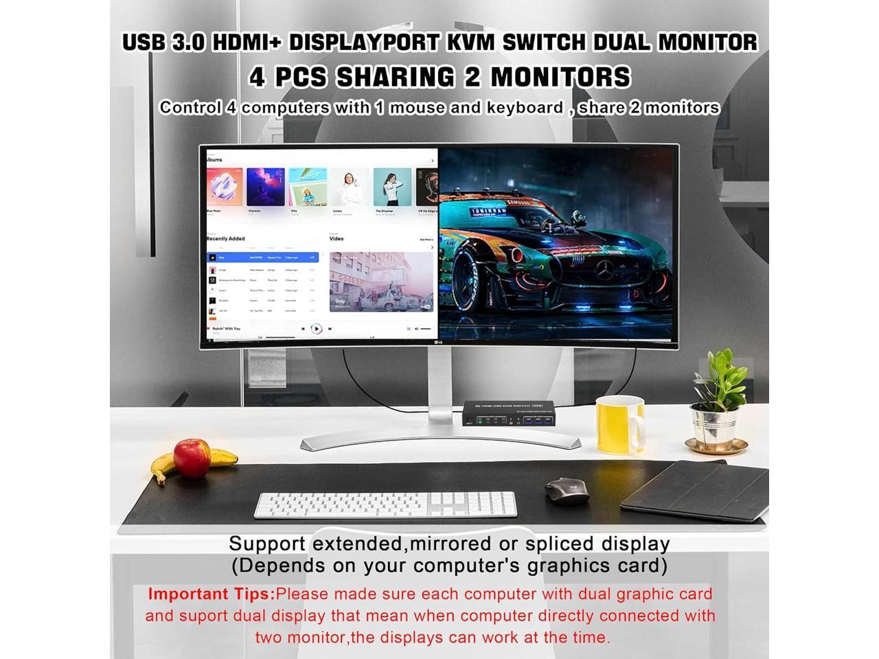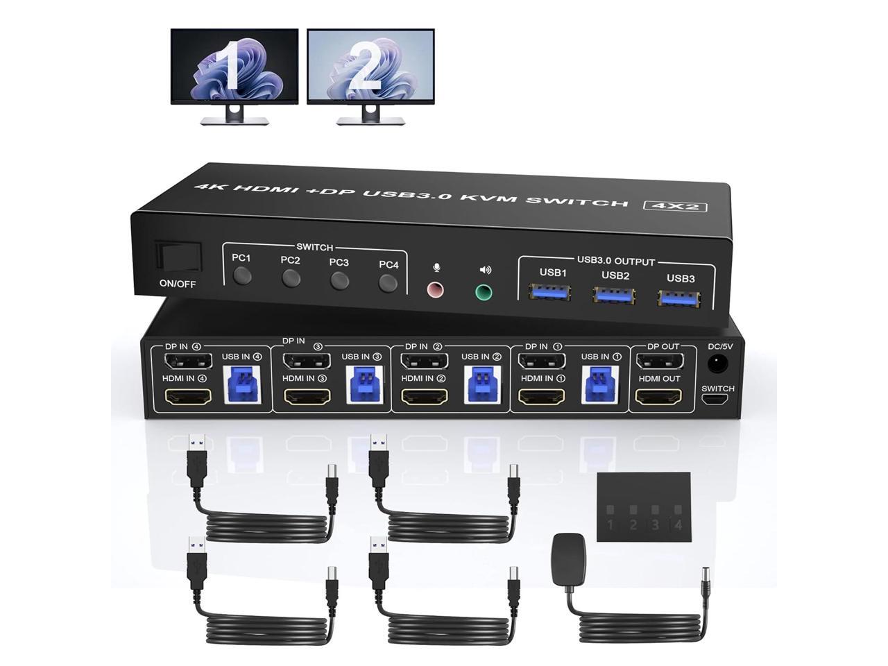 - DisplayPort HDMI Dual Monitor KVM Switch: This KVM Switch allows you to control 4 computers or laptops with one set of keyboard, mouse, and single or dual monitors to make your workspace tidy and efficient. Note: This dual monitor KVM supports HDMI + DP dual-screen display (This function requires your PC to support dual display or multi-display, then you can use this KVM to achieve 4 PCs to share 2 monitors