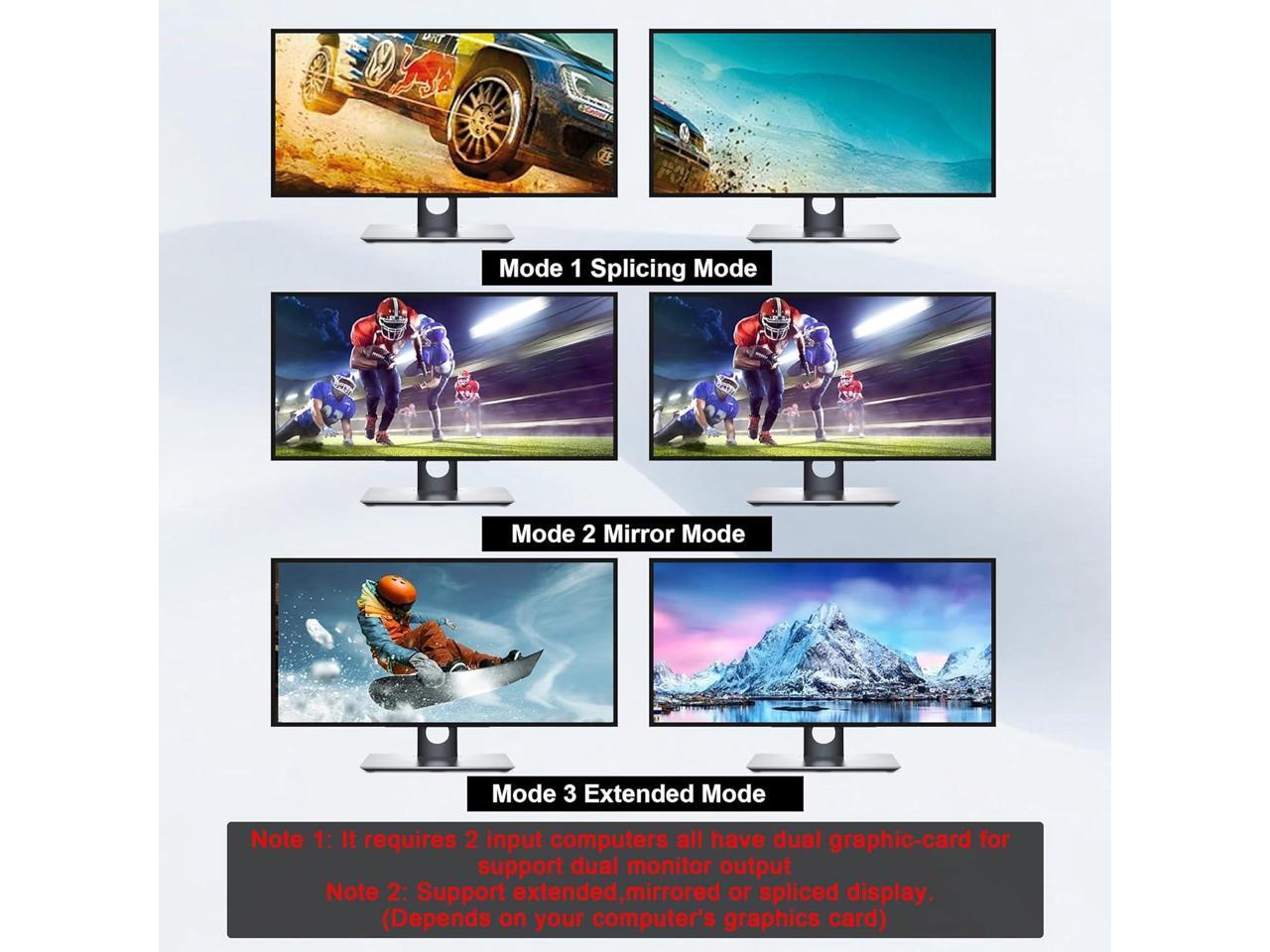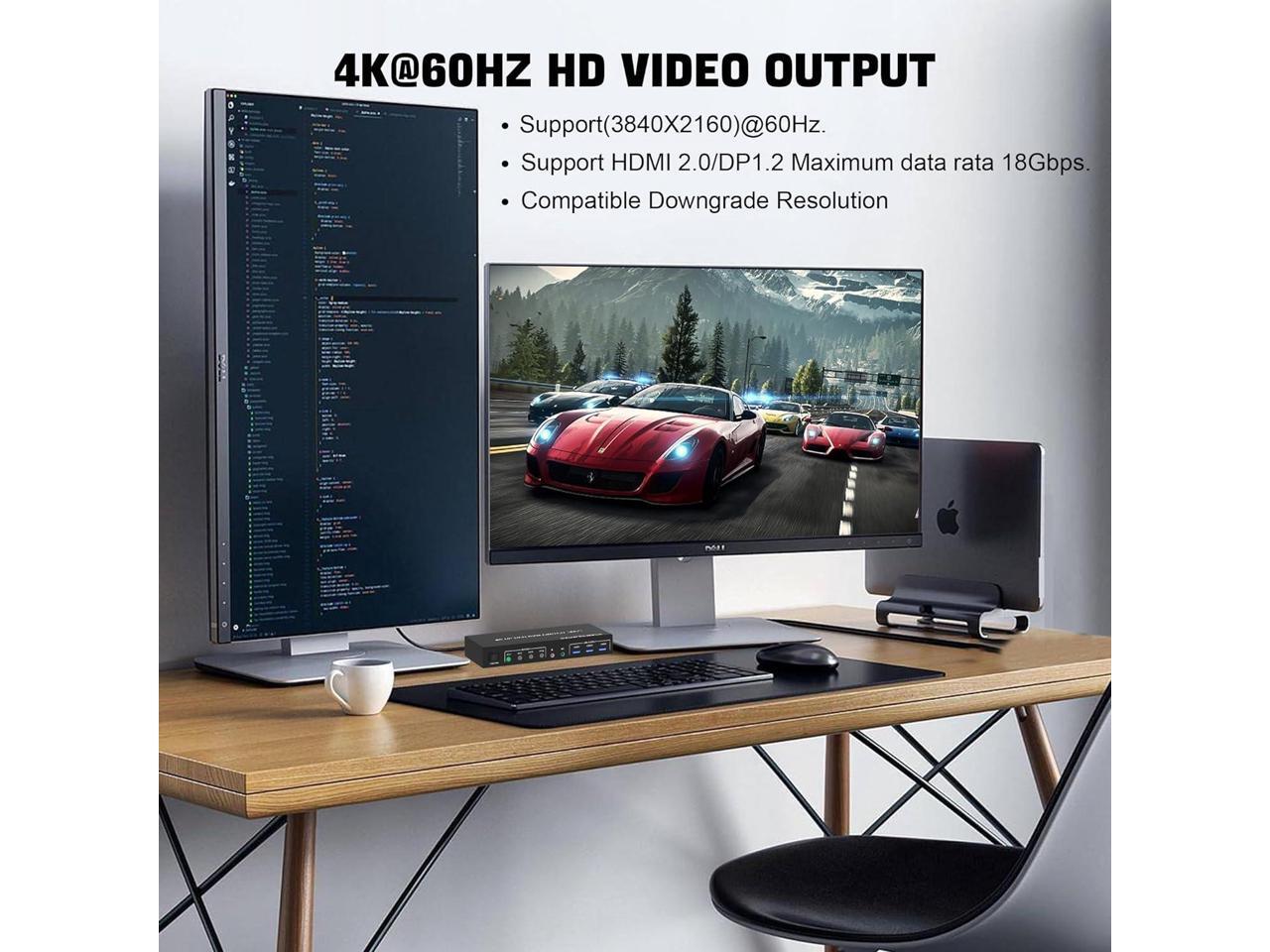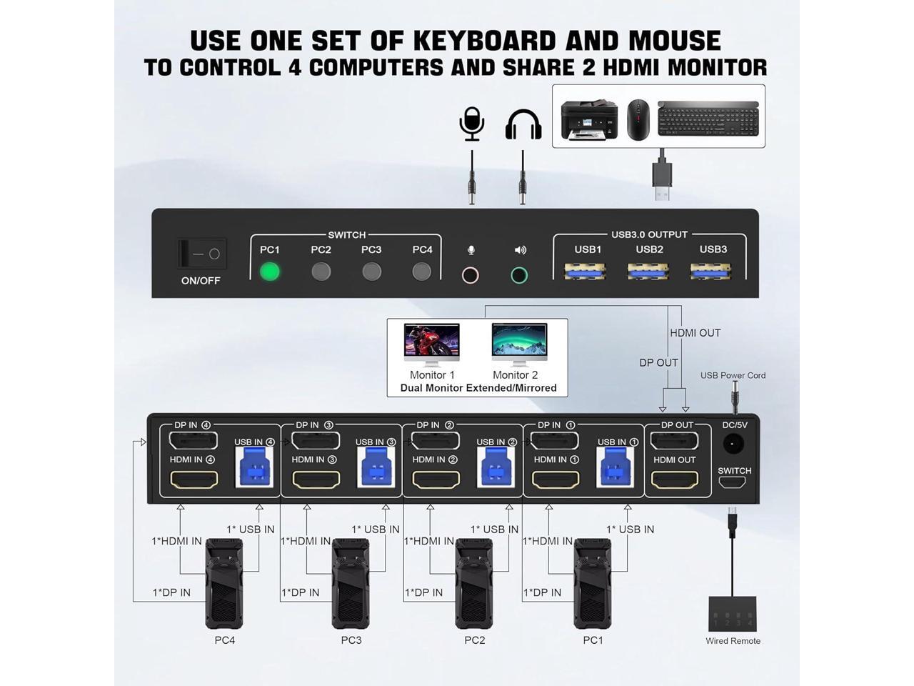 - DisplayPort HDMI Dual Monitor KVM Switch: This KVM Switch allows you to control 4 computers or laptops with one set of keyboard, mouse, and single or dual monitors to make your workspace tidy and efficient. Note: This dual monitor KVM supports HDMI + DP dual-screen display (This function requires your PC to support dual display or multi-display, then you can use this KVM to achieve 4 PCs to share 2 monitors