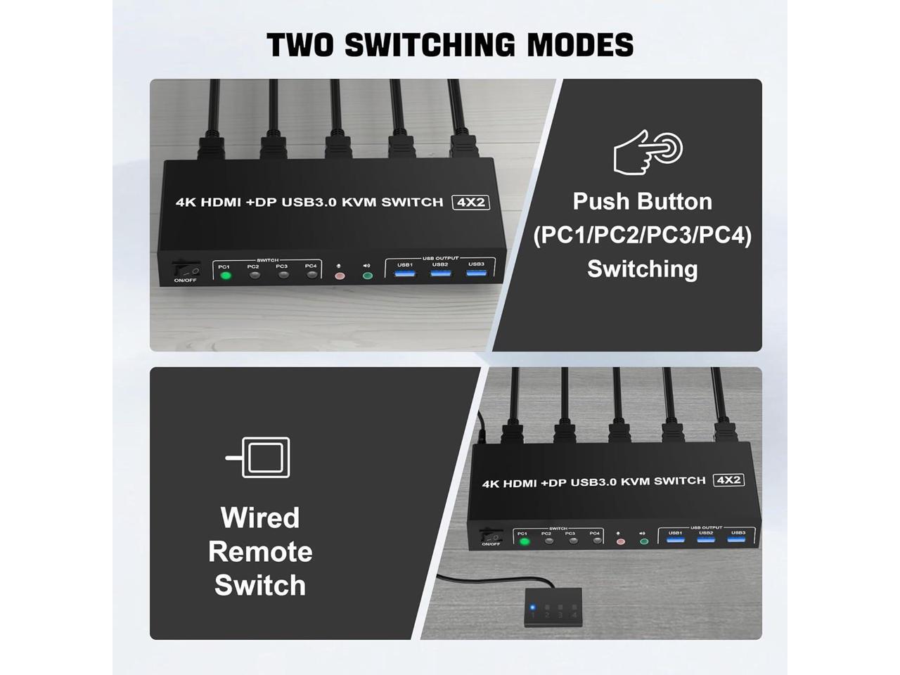 - Support 2 Switching Modes & LED Indicator: 1. Buttons switching, just need one click switch to the designated computer;2.Wired remote switch. LED indicates the active computer. The package comes with an external power.