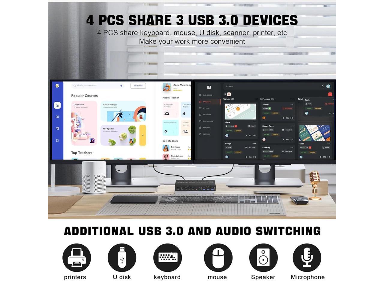 USB 3.0 Displayport+HDMI Dual Monitor KVM Switch for 4 PCs, 4K 60Hz KVM Switch 2 Monitors 4 Computers, with Audio Microphone Output and 3 USB 3.0 Ports, HDMI+DP Monitor KVM Switch for 4 PCs 2 Monitors