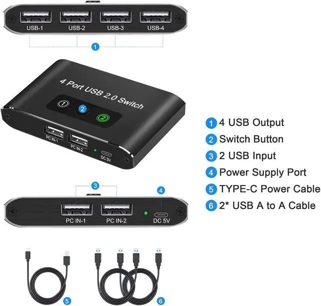 | Package Included | 1*USB 2.0 switcher, 2*USB 2.0 Cable, 1*User Manual, 1*USB C Charging Cable |