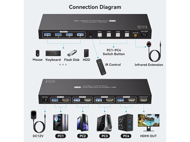 - [Stable Transmission&2 switching modes] Includes a 12V1A external power adapter for stable recognition of high-power USB devices with the KVM. You can switch between 4 computers using the infrared remote control or panel buttons, with LED lights indicating the active computer.
