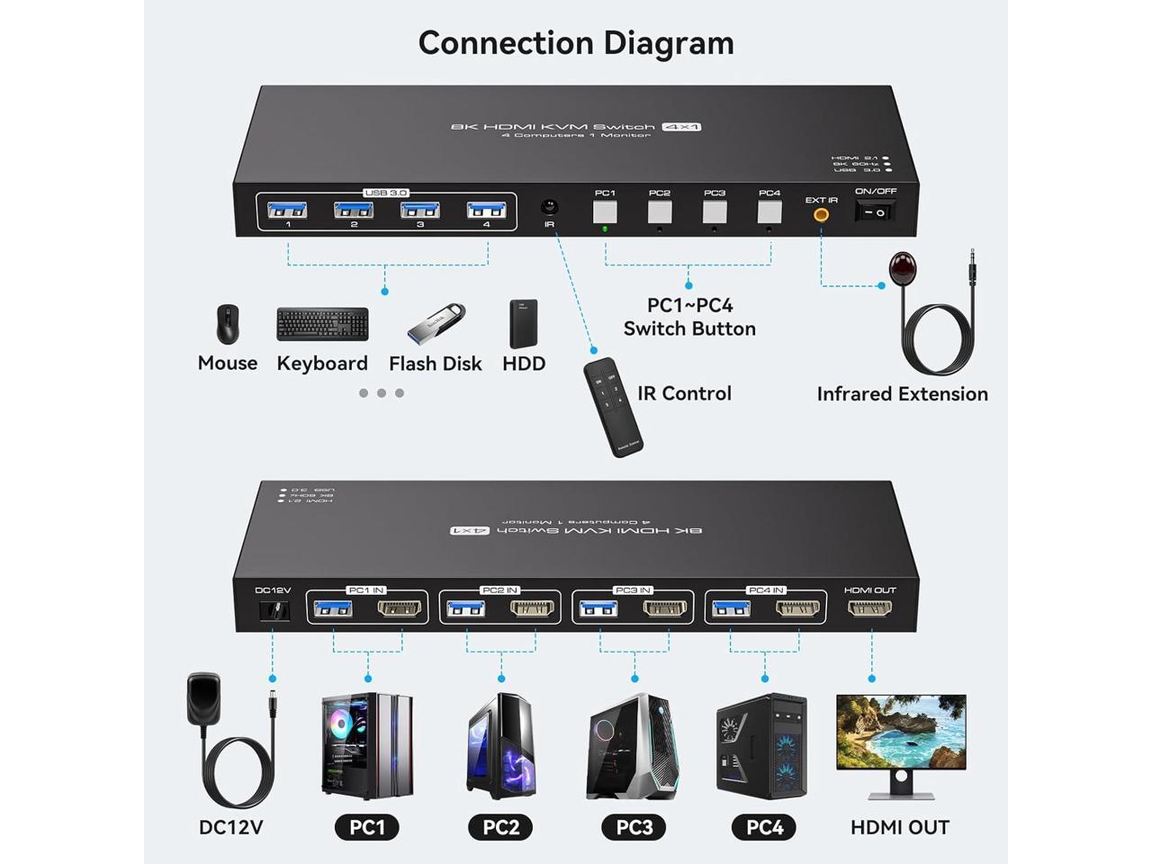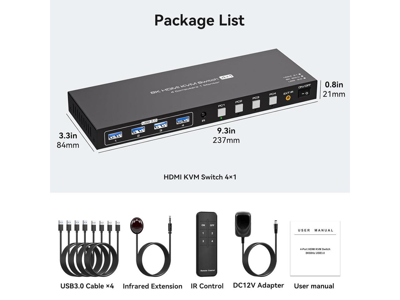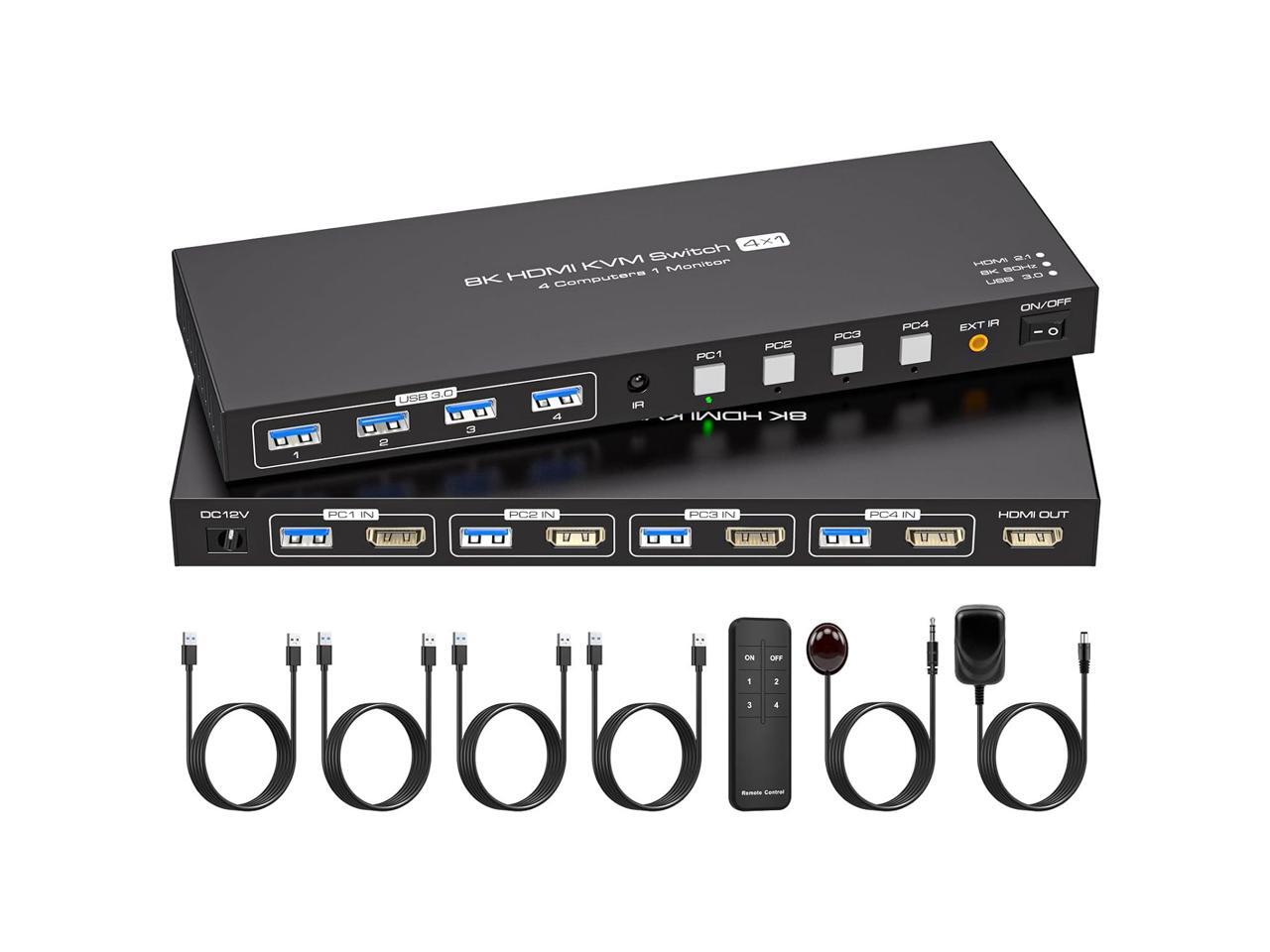 HDMI 2.1 KVM Switch 4 Computers 1 Monitor, 8K@60Hz 4K@120Hz 4 Port HDMI KVM Switches For 4 PCs Share 4 USB Devices Like Keyboard Mouse Printer etc. With Remote Controller & Other External Accessories