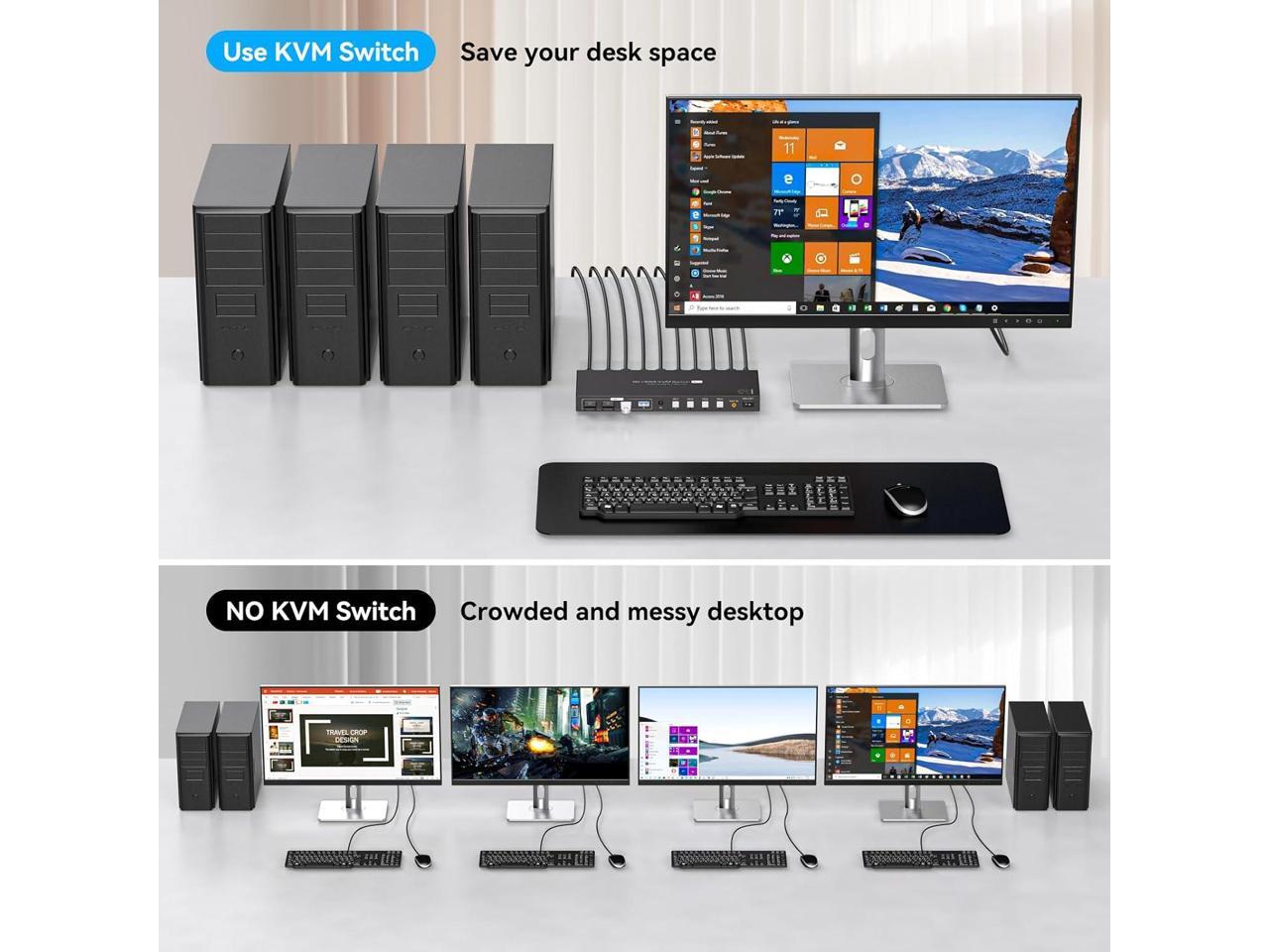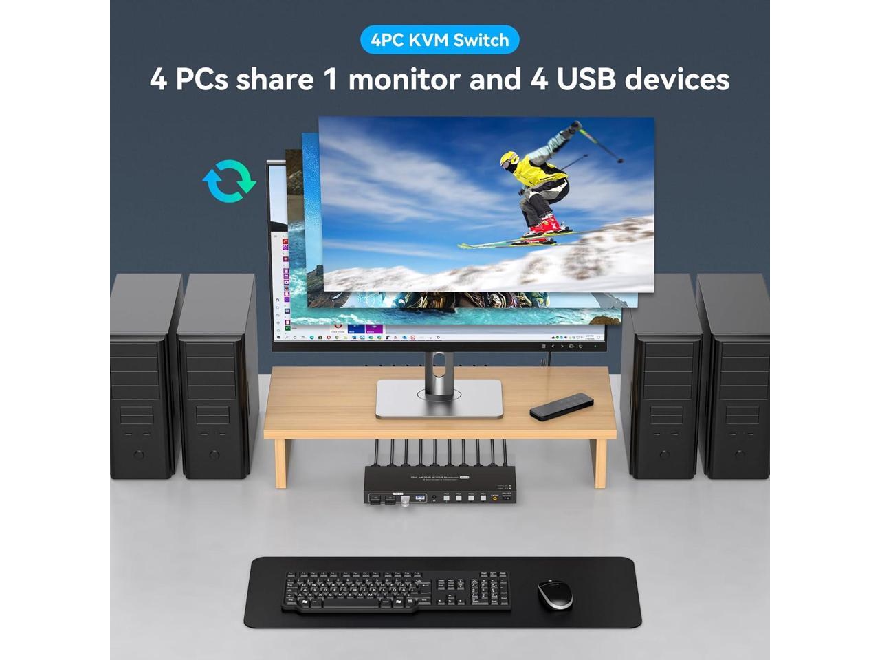 - [KVM switch 4 computers] The KVM switch allows 4 computers or laptops to share 1 monitor and 4 USB 3.0 devices. You can control all 4 computers directly with a single set of mouse and keyboard.