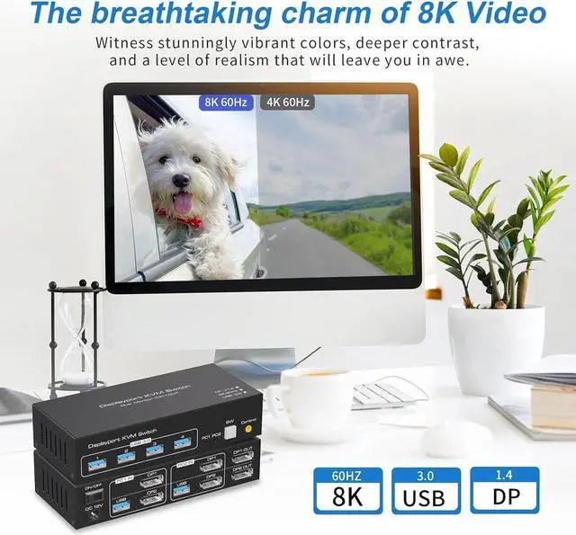 The KVM Switch Displayport 2 port allows two computers to share two monitors, a keyboard, mouse, and other USB devices, saving you office space and avoiding frequent unplugging that can lead to device damage.