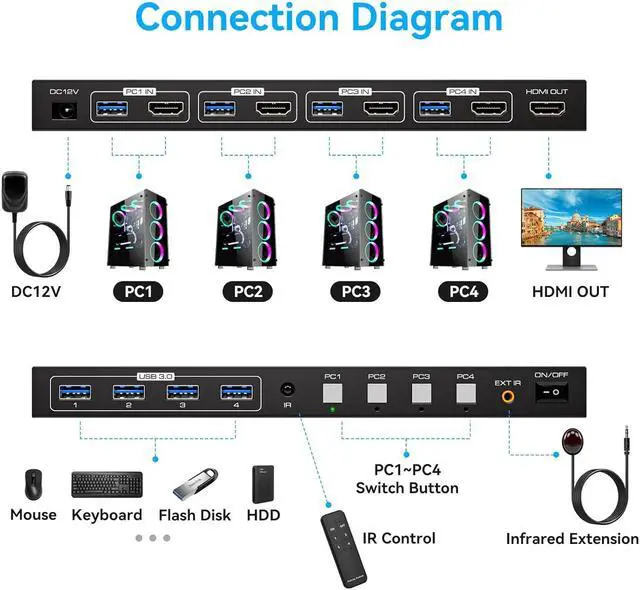 The HDMI KVM switch 4 port allows 4 computers to share one monitor and 4 USB 3.0 devices, enabling you to control 4 computers and one monitor directly with a single set of mouse and keyboard.
