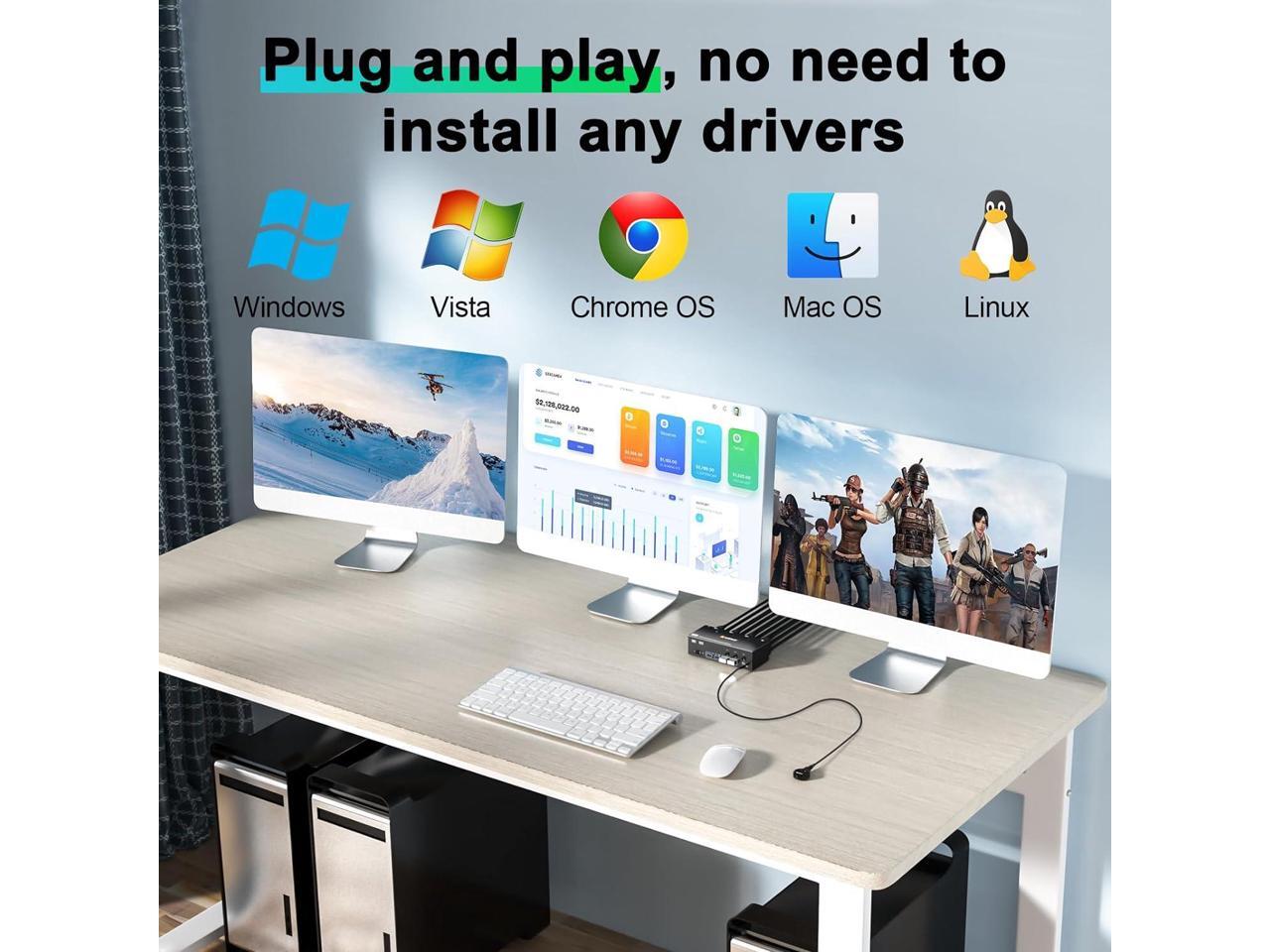 - [Triple Monitor KVM Switch] This KVM switch perfect for hooking up 3 desktops /laptops to share one set of wired or wireless keyboard mouse and 3 monitors (supports extended and mirrored display modes). Please note: extended mode can output three differen
