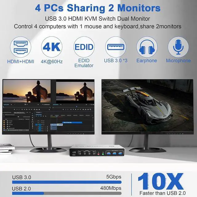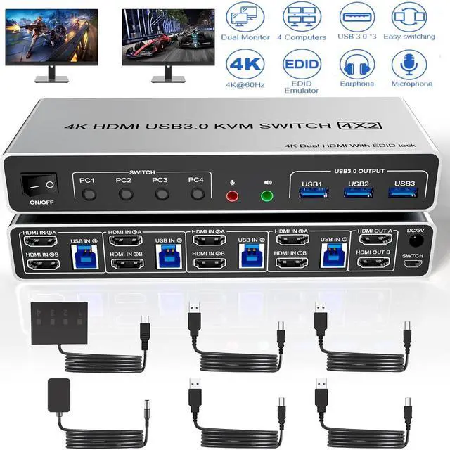 USB 3.0 4 Port HDMI + HDMI Dual Monitor KVM Switch 4K@60Hz for 4 Computers