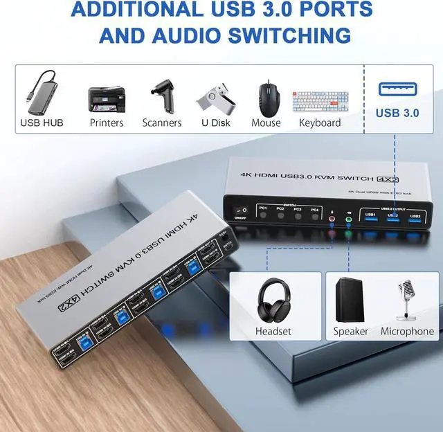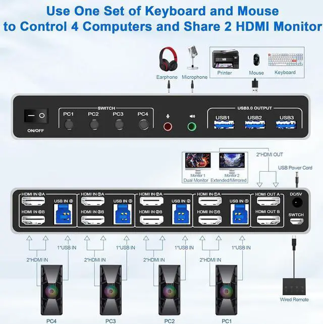 - 4 computers/laptops share one set of keyboard, mouse and dual monitors, USB 3.0 ports, microphone and audio port;