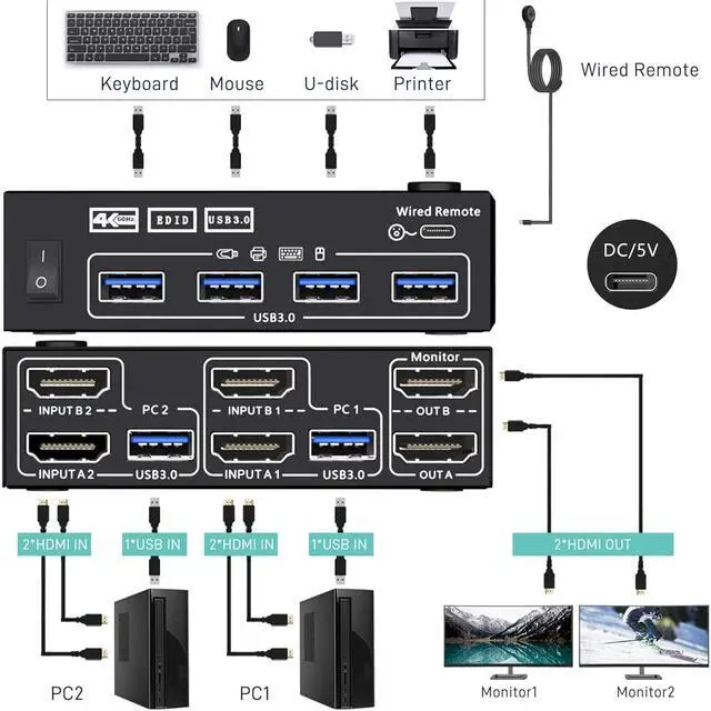 - This Dual Monitor KVM Switch requires 2* HDMI+1*USB input for each PC and 2* HDMI output for monitors. for PCs which do not have 2 HDMI output, it support USB-C/DP to HDMI converter and USB-C docking station