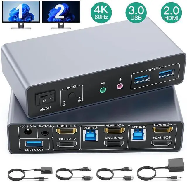 The HDMI KVM switches 2 monitors 2 computers supports up to 4K@60Hz screen display. Backward compatible with 4K@30Hz, 1080P.