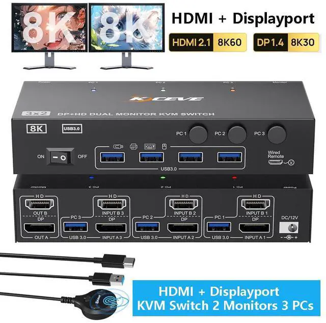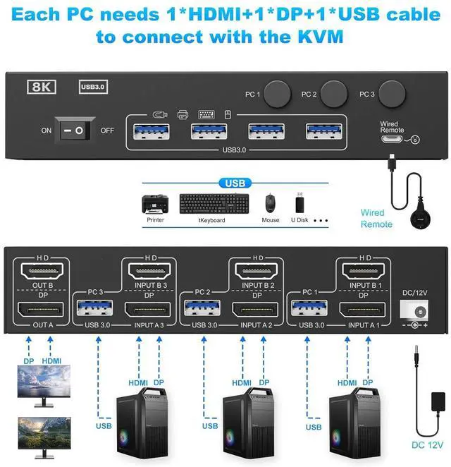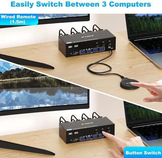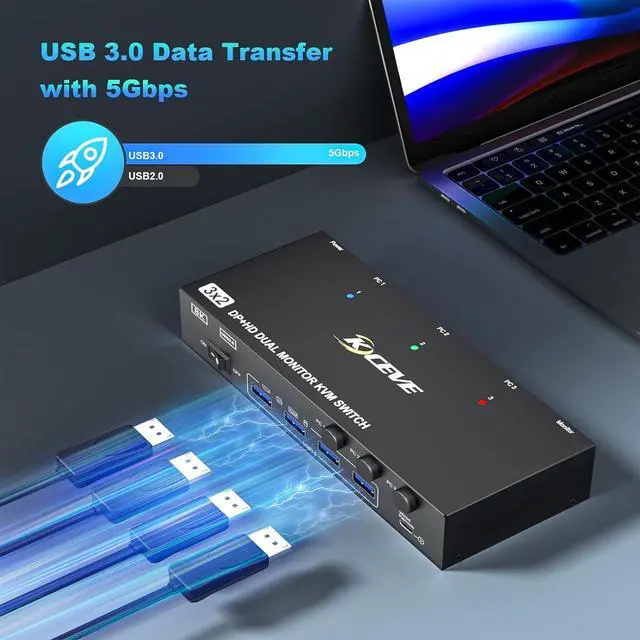 USB 3.0 KVM switch 3 computers 2 monitors transfer files in Seconds. This dual display KVM Switch supports ultra-fast USB 3.0 data transfer rates of up to 5Gb/s. With 4 USB3.0 ports for peripheral USB devices such as keyboard, mouse, printer, etc. Support wireless or bluetooth keyboard and mouse.