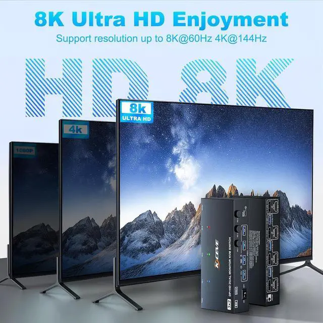 2 monitor KVM Switch Displayport support resolution up to 4K@144Hz,8K@30Hz.