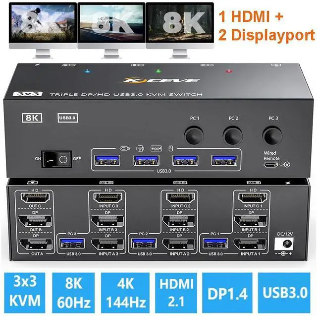 Each PC requires 1*HDMI+2*DP+1* USB cable to connect the 3 monitor KVM switch,OUT A, OUT B, OUT C connect to 3 monitors.Support DP to HDMI, USB-C to HDMI, USB-C to DP converter and USB-C docking station.