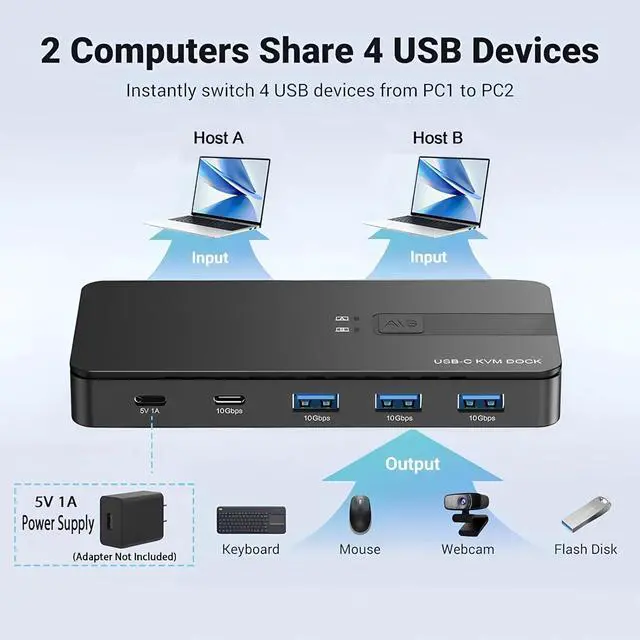 USB C 3.2 Switch Selector: This USB 3.2 switch featured with 1 USB C port and 3 USB A ports, allowing you to connect a variety of USB devices. The USB C port can be linked to a USB C hub or other USB C devices, expanding the available ports for both computers. (Power Supply Required For Stable Work When USing Multi Devices or Big Power Concumption Devices Such As HDD )
