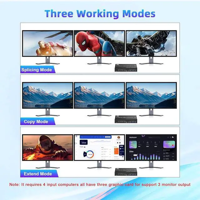 2) The requirement for this KVM to achieve a triple-screen display is that each PC you connect to has the capability to support a triple-screen display. This has nothing to do with KVM.