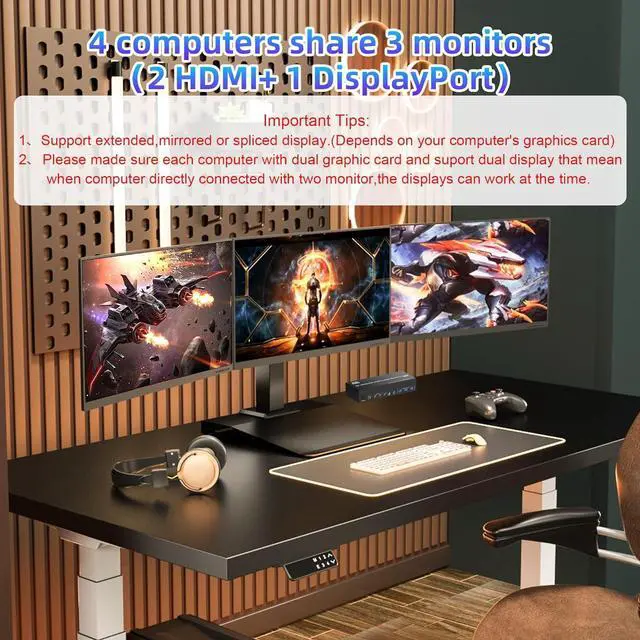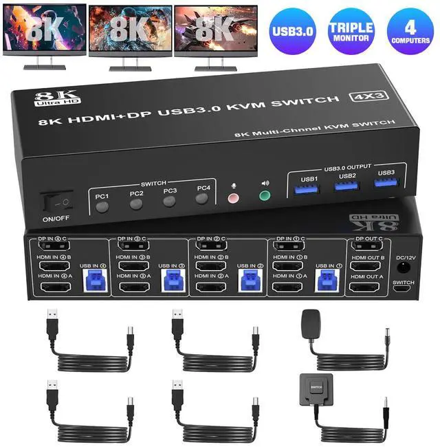 1. 8K 3 monitor kvm switches allows 4 computers/laptops share one set of keyboard, mouse, and 3 monitors (2 HDMI + 1 DisplayPort)